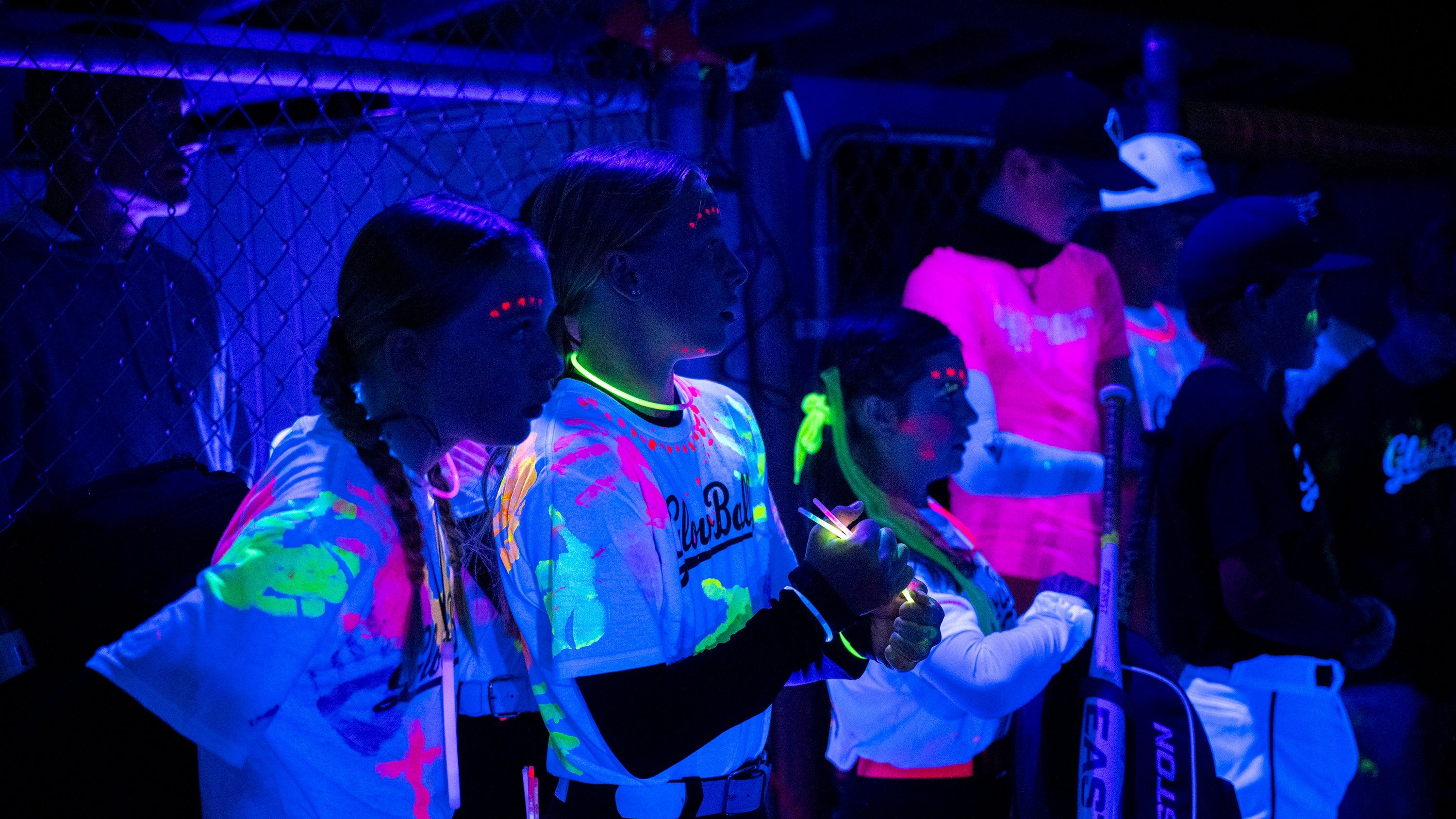 wild crowd energy. This is traditional slowpitch softball at its core — with pitchers lobbing underhand as usual — but once the blacklights flip on, the GlowBall magic takes over.