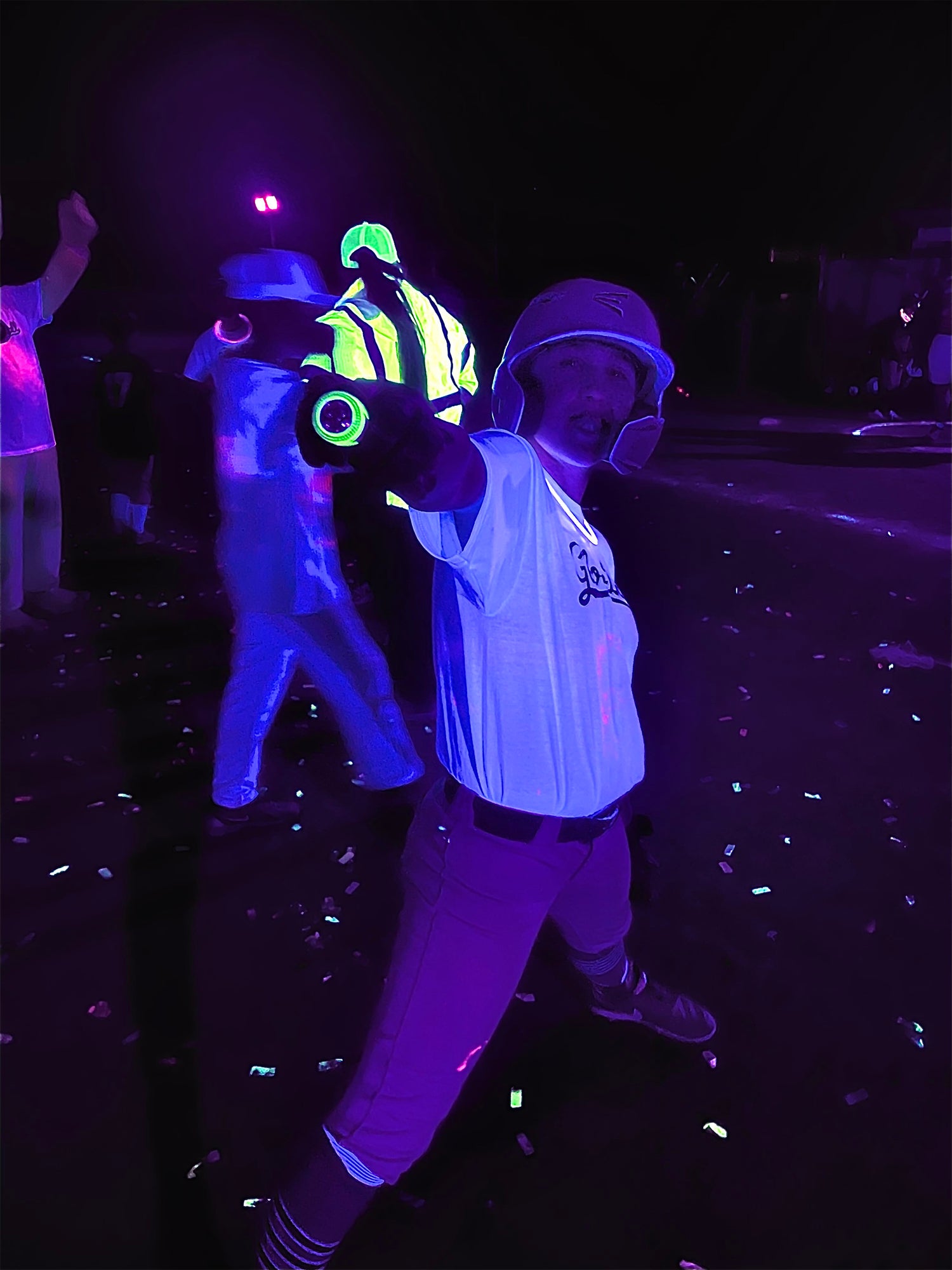 GlowBall is a nighttime blacklight baseball experience where cosmic rules, glowing gear, and theatrical gameplay collide. Designed for fun, energy, and creativity, the game puts style on the same level as skill. It’s baseball flipped on its glowing head — with light-up gear, live DJs, alien themes, and unpredictable twists like alien abductions and on-field power cards triggered by crowd energy or gameplay moments.